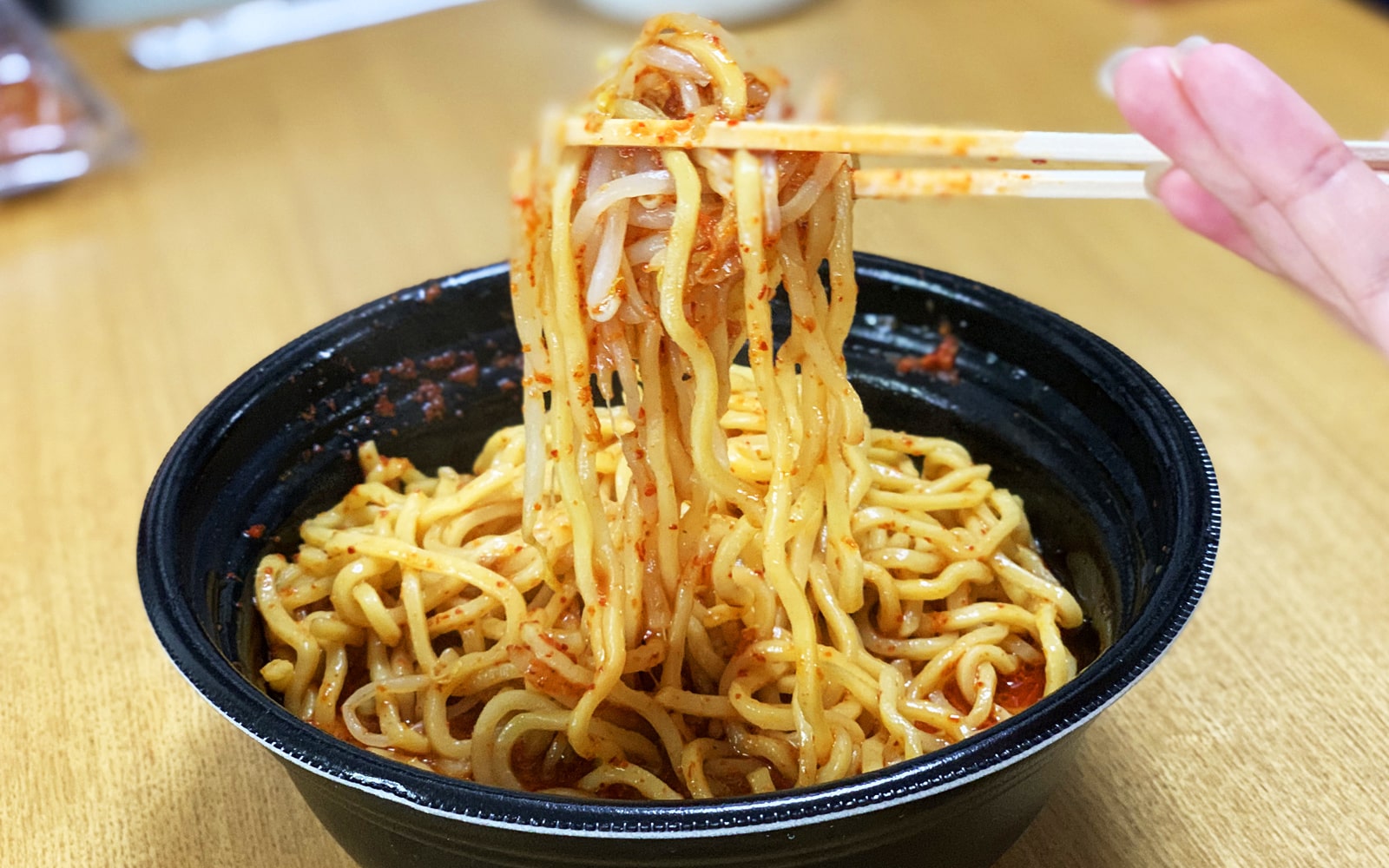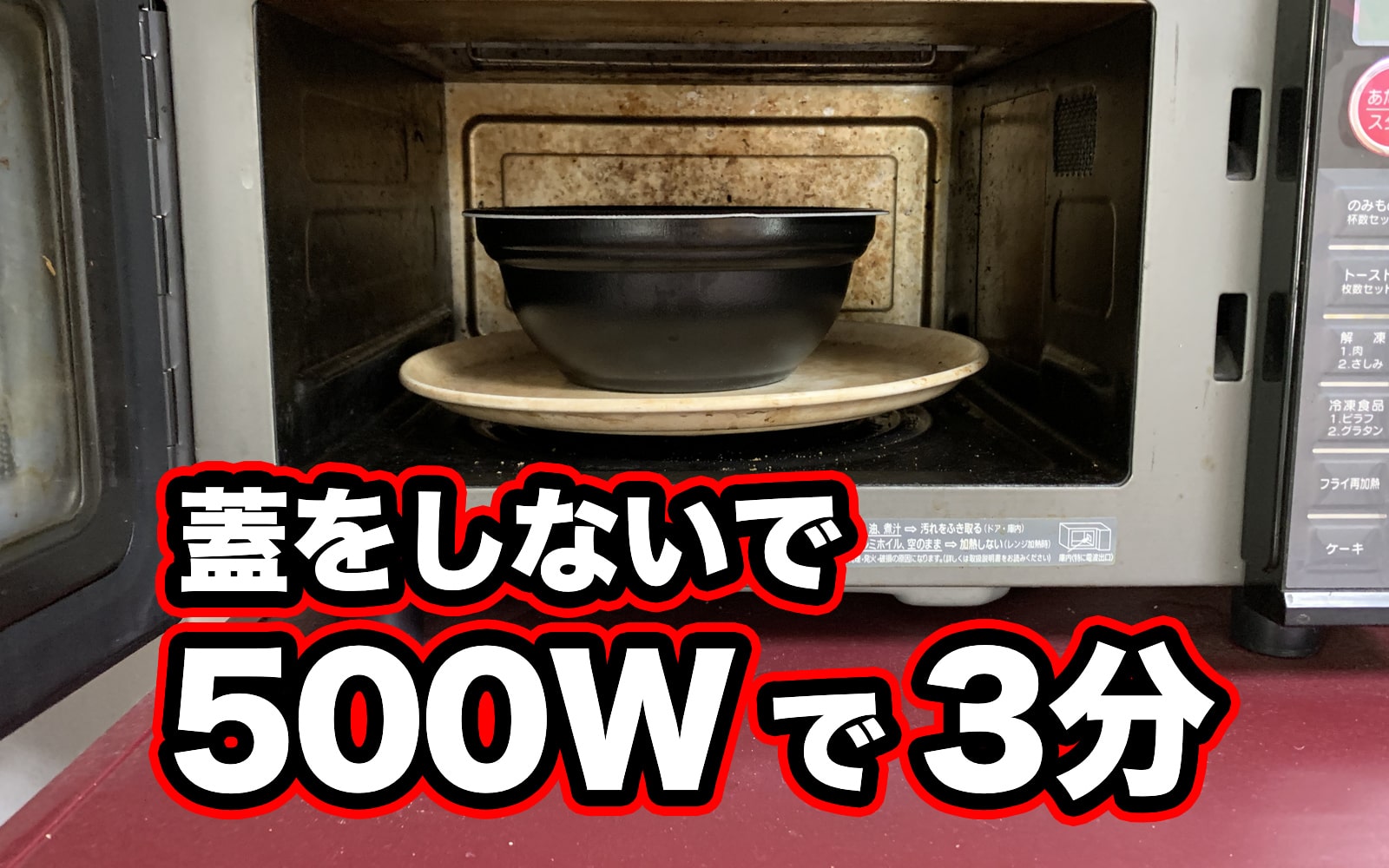 麺をスープに滑り込ませ、蓋と中蓋をしないで電子レンジへ!