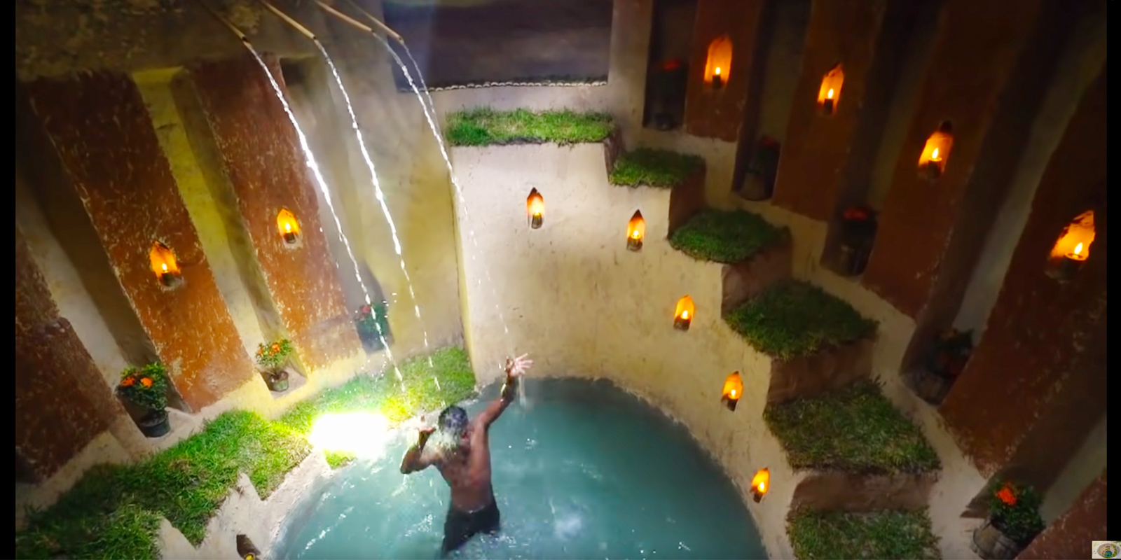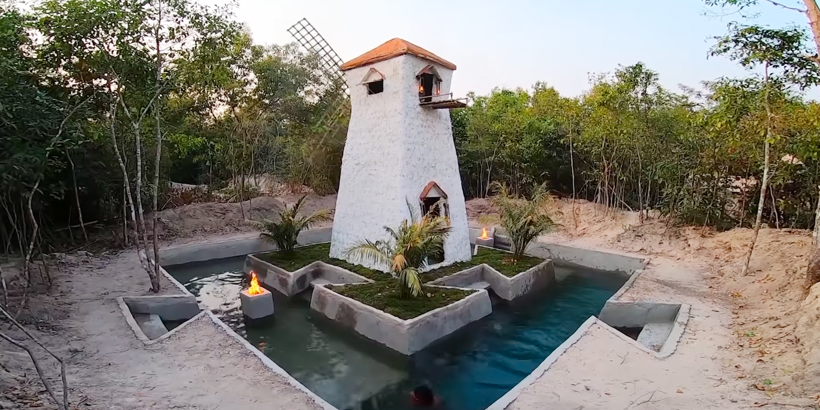 私が見たチャンネルはPrimitive Unique Toolというアジア圏の方のチャンネルで、他の動画を見てみると、プールだけじゃなくて家を建てたり、建てた家から滑り台つけてウォータースライダー作ったり、、、。